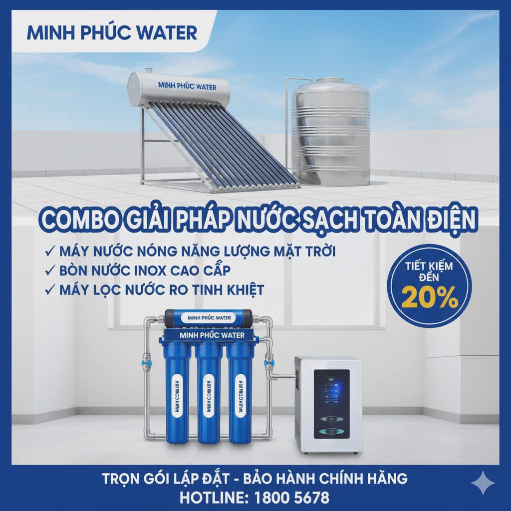 Combo cơ bản cho gia đình 4 thành viên gồm Bồn nước inox Sơn Hà 1000l, Máy nước nóng năng lượng mặt trời 140l, Hệ lọc tổng compusite gia đình , Máy lọc nước Karofi nóng nguội lạnh RO 10 lõi 15L/H